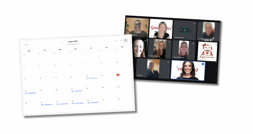 Každý měsíc pro vás připravujeme nabitý program. V našem sdíleném komunitním kalendáři najdete všechny naplánované workshopy, expertní webináře, mentoringové cally i neformální virtuální kávy. Vždy tak přesně víte, co vás čeká, a můžete si svůj rozvoj snadno naplánovat. A pokud něco zmeškáte? Záznam vždy čeká v archivu.